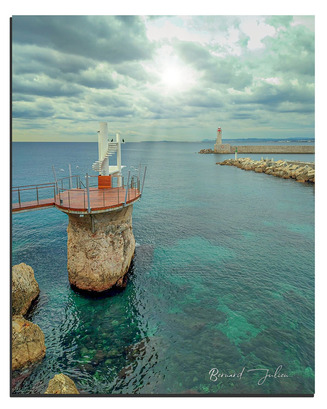 Le plongeoir à Nice sur la Côte d'Azur avec les eaux limpides, cristallines, de la mer Méditerranée avec un pâle coucher de soleil d'hiver.