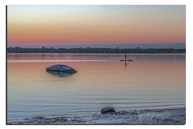 Coucher de soleil sur un marais salant avec un bateau coulé et un surfeur