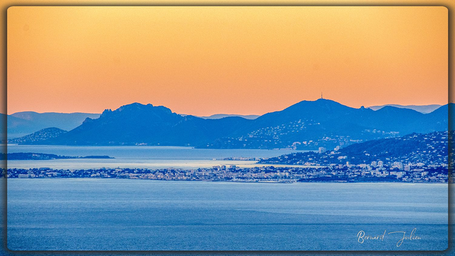 Ciel doré par un coucher de soleil sur les montagnes en bord de mer