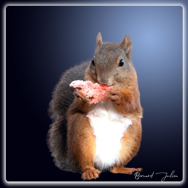 Un écureuil roux mangeant de la pastèque avec un fond bleu en dégradé