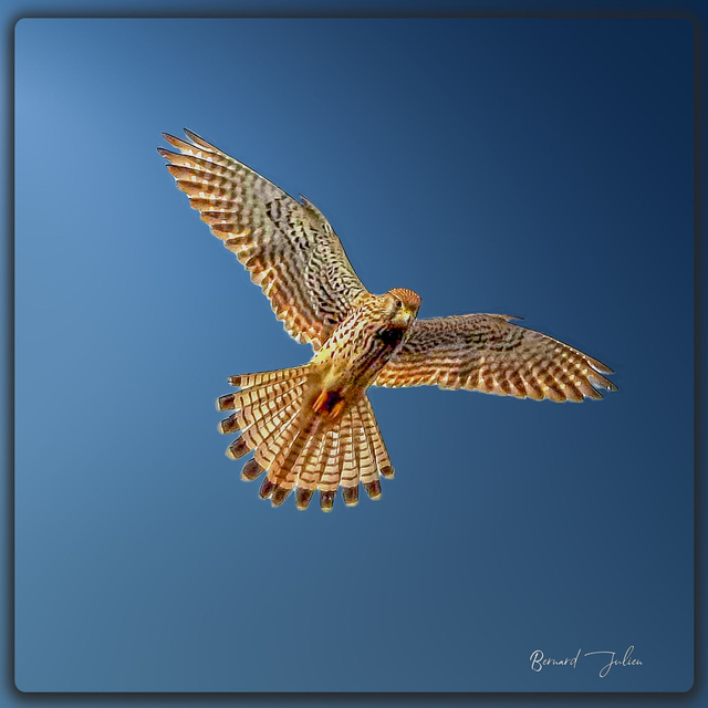 Un faucon crécerelle en vol stationnaire avec ses ailes déployées
