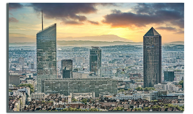 Ville de Lyon et ses grattes ciel au coucher de soleil depuis les pentes de la Croix Rousse