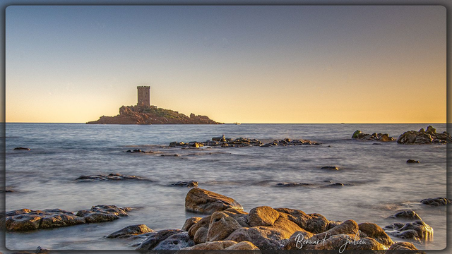 Paysage de bord de mer en pose longue sur la Côte d'Azur avec le fort de l'île d'Or.