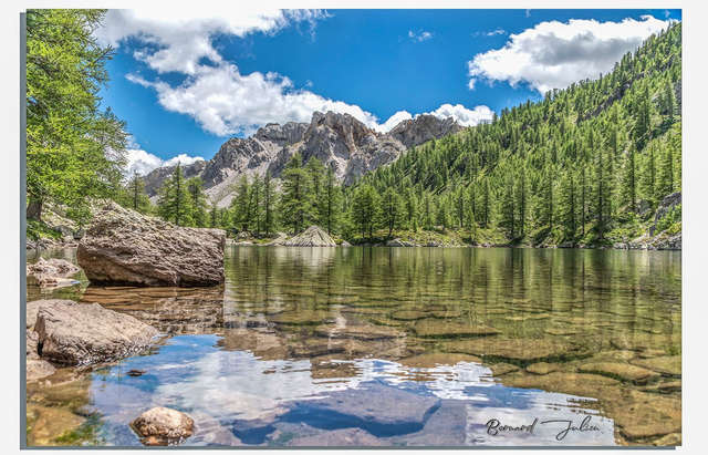 Reflet d'un paysage de montagne du Mercantour dans les eaux cristallines du lac Vert.