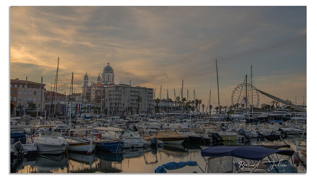 Premières lueurs du jour avant le lever de soleil sur le port et la cathédrale de Saint Raphaël sur la Côte d'Azur