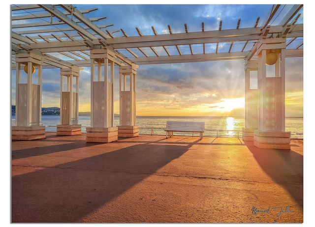 La promenade des anglais à Nice sur la Côte d'Azur avec ses pergolas et un lever de soleil sur la mer