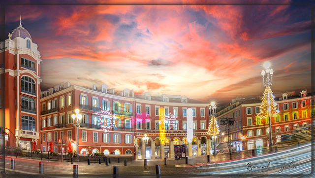 Place Massena à Nice sur la Côte d'Azur lors des fêtes de fin d'année, avec un ciel de feu à la tombée de la nuit