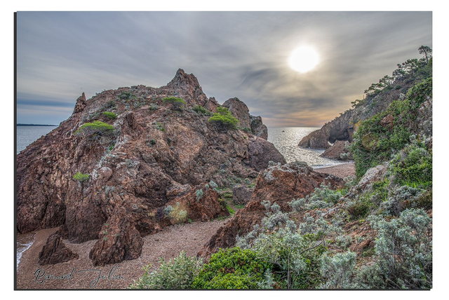 La pointe de l'aiguille en bord de mer sur la Côte d'Azur lors d'un pâle coucher de soleil en mer