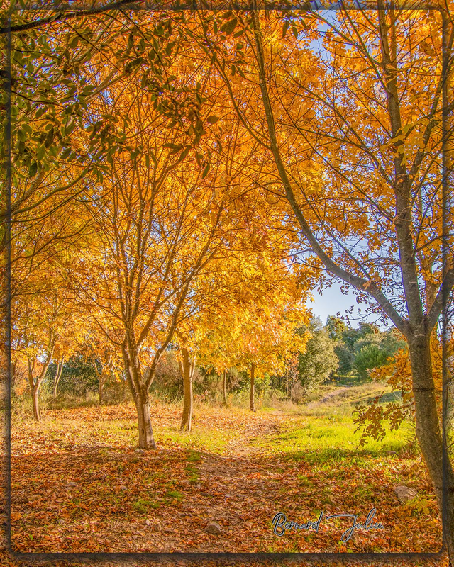 Allée en sous bois avec les couleurs chaudes de l'automne