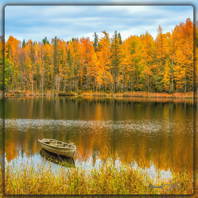Barque sur un lac entouré d'arbres aux couleurs chaudes de l'automne.